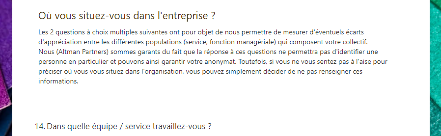- Laisser à vos collaborateurs le temps de remplir le questionnaire et mener, en parallèle, les interviews complémentaires auprès des collaborateurs tirés au sort (2 semaines)