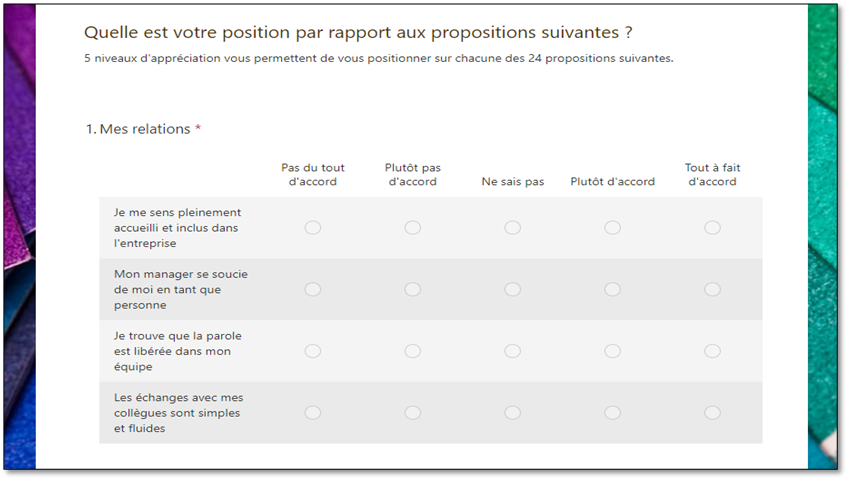 - Les relations : se sentir à sa place, inclus, compétent, important pour le système demeure une condition sine qua non de l’investissement individuel dans un projet. Cette perception est intimement liée à la qualité de la relation aux autres et au travail au sein de l’entreprise.